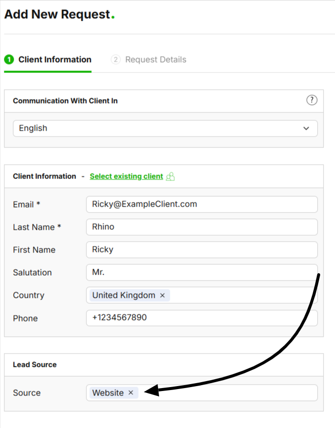 If you want to add the source from which you received the request, this is done simply on the request page as you're adding the client information.